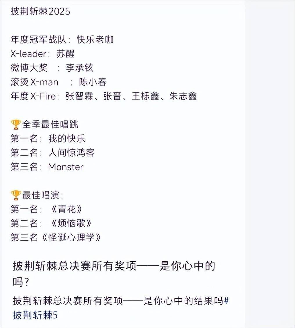 节目刚开播的时候,李承铉就表示自己想拿到“X-leader”,所以大家都认为他会获得“X-leader”,而快乐老咖会获得冠军,这样的结果,应该会让所有人满意,但让大家没想到的是,获得冠军战队的队长,会直接获得“X-leader”,从网传的消息上看,快乐老咖获得冠军,而“X-leader”属于苏醒。